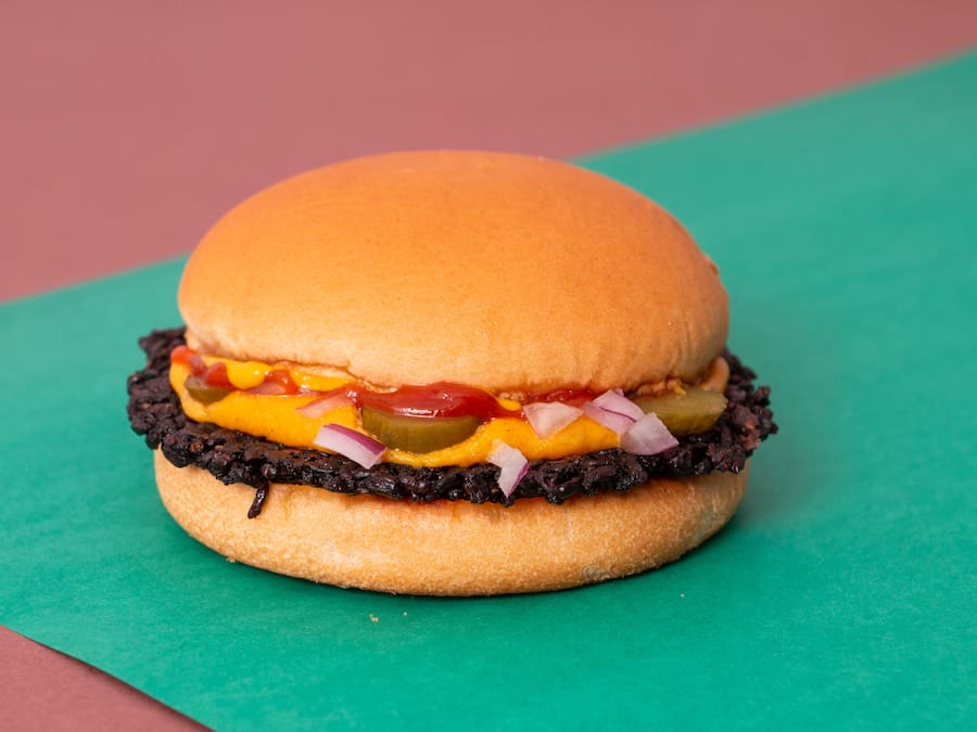 Hambúrguer com um smash de arroz negro, queijo da Víveris, tofu defumado, cebola, picles, ketchup, mostarda num pão muito macio.