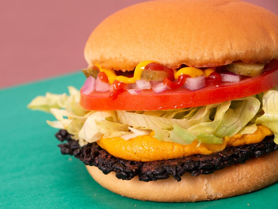 Hambúrguer com um smash de arroz negro, queijo da Víveris, tofu defumado, alface, tomate, cebola, picles, ketchup, mostarda num pão muito macio.