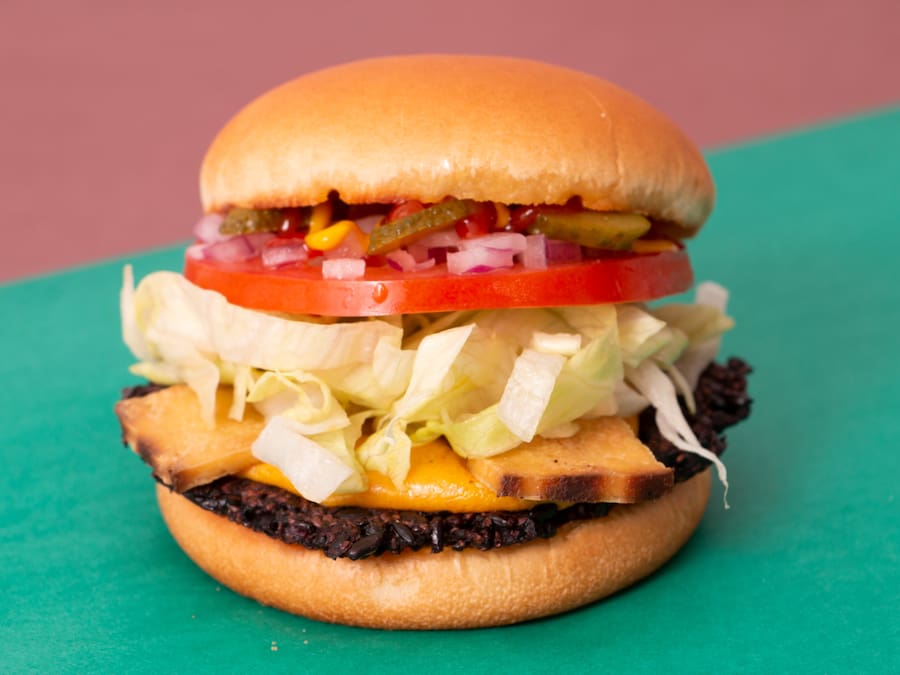 Hambúrguer com um smash de arroz negro, queijo da Víveris, tofu defumado, alface, tomate, cebola, picles, ketchup, mostarda num pão muito macio.