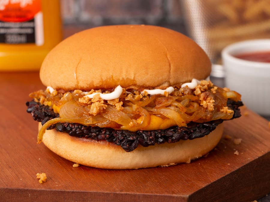 Hambúrguer de arroz negro, queijo da Víveris, crispy de tofu defumado, cebola caramelizada e maionese num pão muito macio.